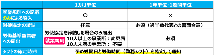 続いて、制度の導入手続きについて解説します。1カ月単位は、就業規則への記載のみで導入でき、労使協定の締結は任意です。手続きの簡便さという点で、3つの制度の中で最も優れています。