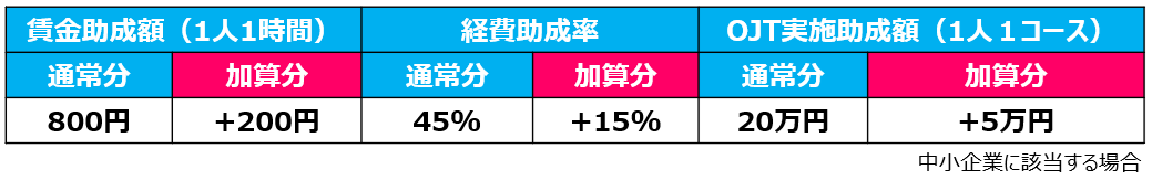 支給対象となる訓練は、10時間以上のOFF-JTです。賃金助成額は1人1時間あたり800円、経費助成率は正規雇用労働者等の場合45%、有期契約労働者等の場合70%です。なお、一定の条件に該当する場合の加算制度が設けられています。