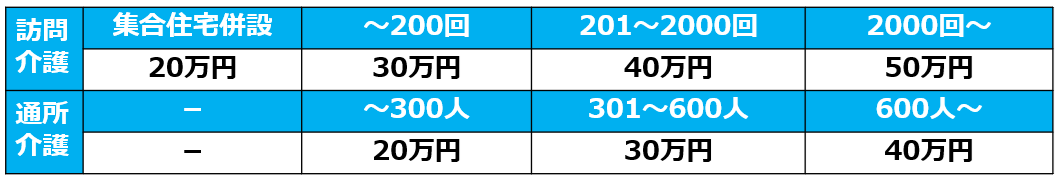 1点目は、訪問・送迎など移動に伴う経費や、設備・備品の購入を支援する枠です。訪問介護は20万~50万円、通所介護は20万~40万円、施設系は定員1人あたり6千円です。訪問介護と通所介護の補助額に幅があるのは、表でご覧のとおり、延べ訪問回数や延べ利用者数によって段階化されているためです。